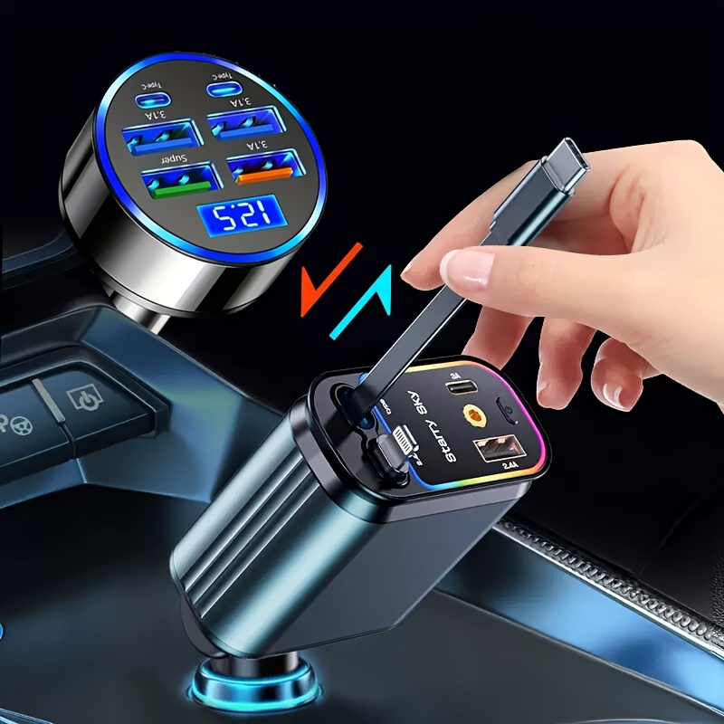 6-in-1 Fast Car Charger with USB-C, Dual PD and QC3.0, 4 Ports & Voltage Display - Matte Finish Texture for a Sleek Look